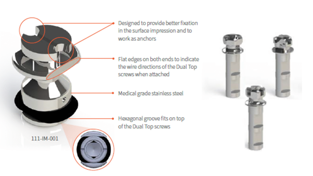 Dual Top Anchor System is used to provide a fixed anchorage point for attachment of orthodontic appliances to facilitate the orthodontic movement of teeth. It is used temporarily and is removed after orthodontic treatment has been completed. Screws are intended for single use only. For use on adults over the age of 12.