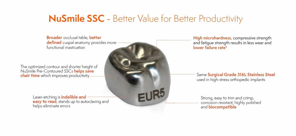 There is a wealth of value in NuSmile Pre-Contoured SSCs. Made from the same Surgical Grade 316L Stainless Steel used in high-stress applications like orthopedic implants, NuSmile SSCs are strong, easy to trim, crimp, and corrosion resistant. Our crowns deliver exceptional design at a great price, and clinicians report NuSmile Pre-Contoured SSCs seldom require additional trimming or crimping compared to other brands.